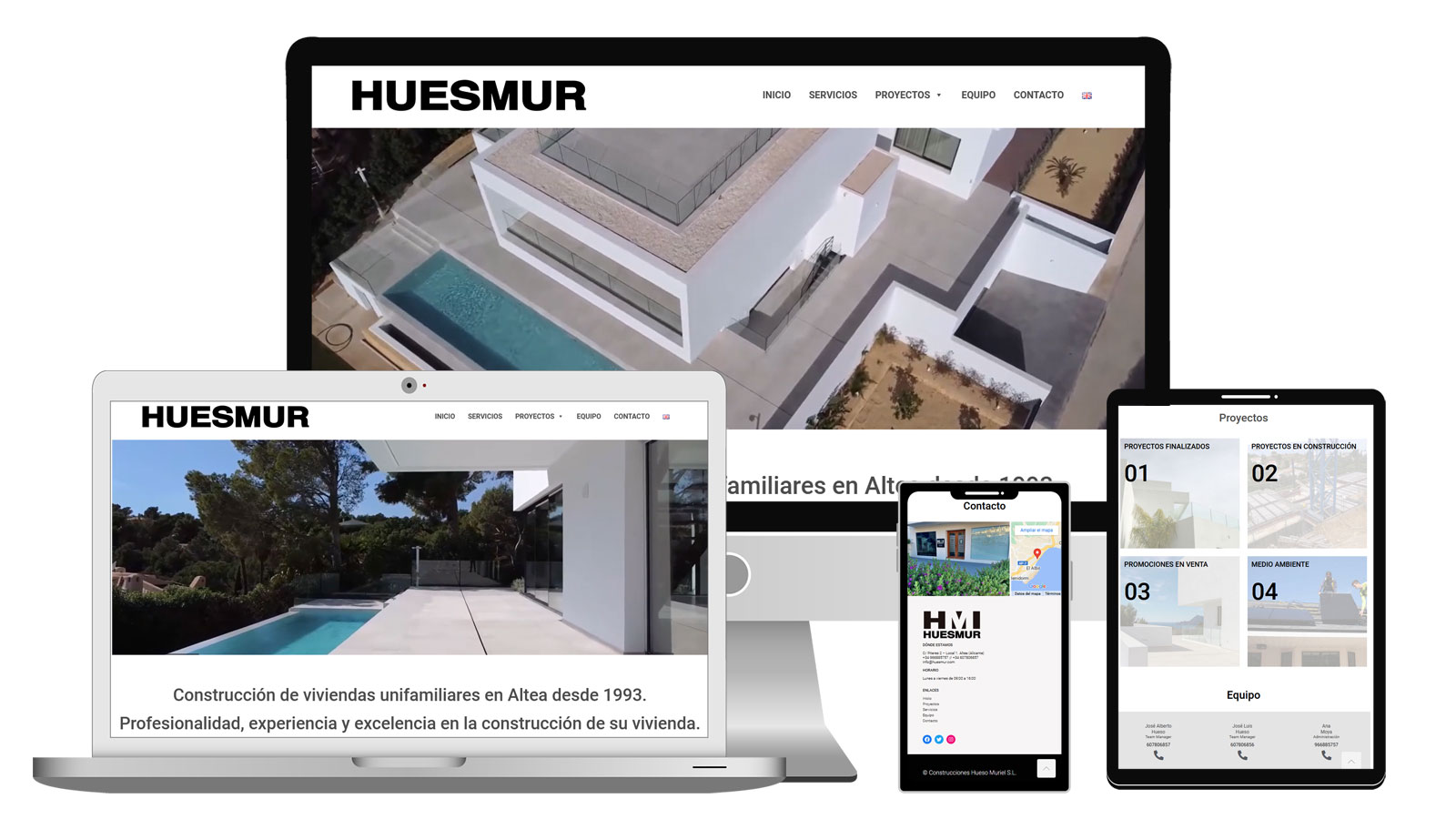 La web de Huesmur construcciones ha sido diseñada a partir de vistosas tipografías que transmiten la solidez de una empresa de construcción de largo recorrido y con amplia experiencia en el sector.